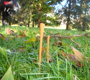 Der Laubstreubewohner ist nach feuchten Witterungen im Spätherbst oft flächenweise mit dichten Beständen zu finden. Die Keule ist gerade einmal über 1 mm dünn und 4 bis 6 cm lang. Die Grundfarbe ist braungelb und kann auch heller sein.