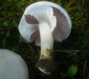 Hut jung halbkugelig, dann abgeflacht, weiß, fein seidig, Rand eingerollt. Lamellen grauweiß, dann graurosa, schließlich schokoladenfarben, frei. Stiel zylindrisch, voll, Ring mit Zahnrad, unter demselben feinkörnelig, auf Druck gilbend. Fleisch weiß, gilbend, mit Anisgeruch.