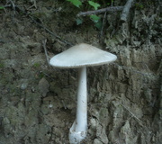 Hut halbkugelig, weißlichgrau bis silbergrau, Rand stark gerieft. Lamellen weißlich bis creme, oft schartig, frei. Stiel unberingt, fein schuppig, ungenattert, Basis verdickt, mit großer weißer häutiger Volva, jung voll, alt hohl. Fleisch weiß, manchmal gelblich. Geruch null.
